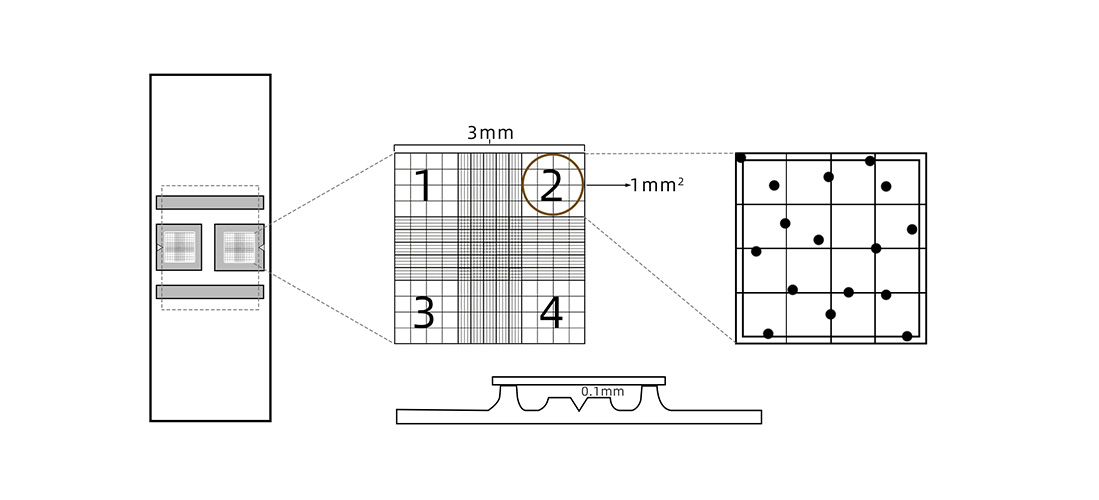 2) 平臺中心部分各以3mm長,3mm寬精確劃分為9個(gè)大方格,稱為計(jì)數(shù)室,每個(gè)大方格面積為1mm2,體積為 0.1mm3;